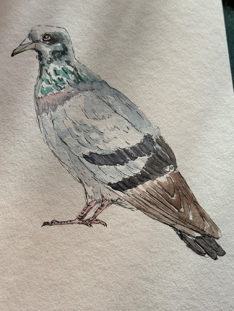 I began with this pigeon, and was happily surprised with how well it turned out. I don’t normally like the look of pen outlines with watercolor—they can detract from the loose fade of the water effects. But for sketches like this, if you leave gaps in the lines and whitespace in the colors, it can have a really nice effect. Whitespace (or negative space) is such a simple yet powerful tool that can totally change the impact of drawings.