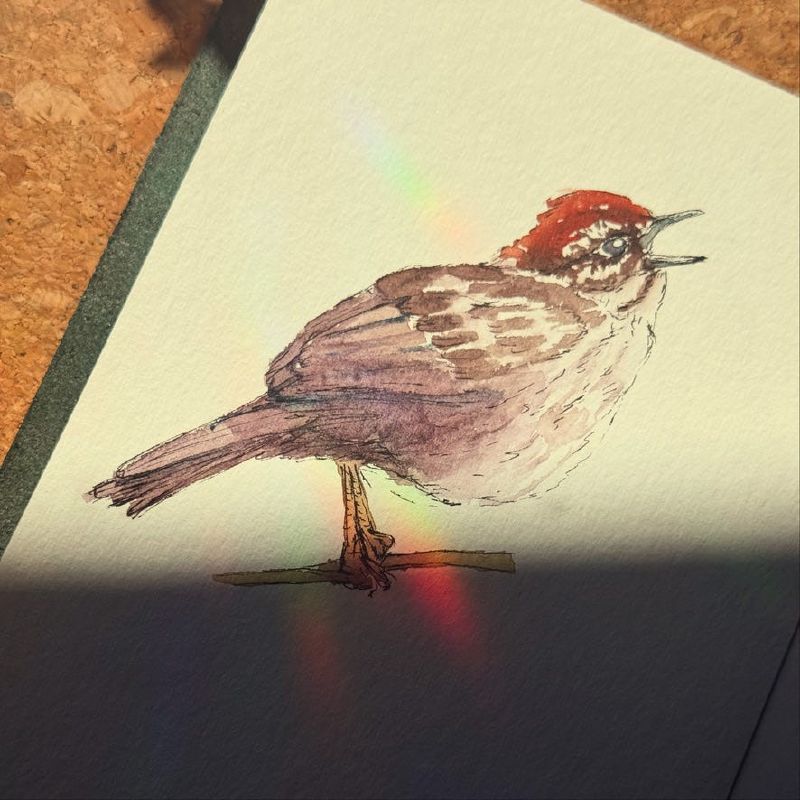 Next up: A song sparrow, singin his heart out. While taking a photo of my sketch, I loved the little rainbow and strong shadow the sunlight was casting on it. I thought it was so neat how I could use the light as part of the composition itself. This is the kind of fun stuff you can do with traditional media, playing with the physicality of the piece itself: