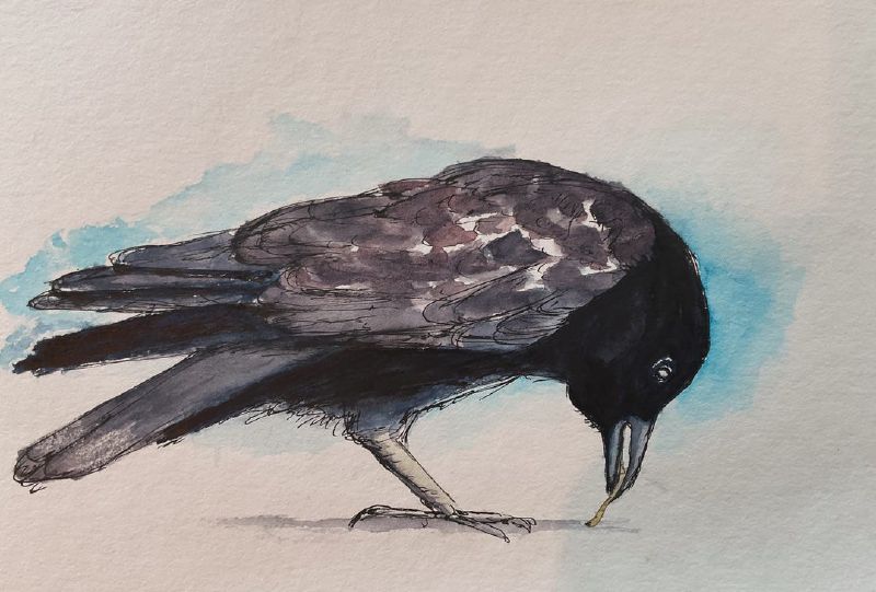 When I drew this crow, at first I didn’t love how loose I got with my pen lines, but once it was done, it really added to the ‘sketchy’ feel along with the watercolor. I think this one’s my favorite of the bunch: