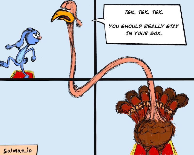 Status police wander our communities, waiting for opportunities to perform an intervention. The minute you try to step out of your assigned box, they show up out of thin air and shove you back in. They serve as a constant reminder of your position and place, and how important it is to them that you stay directly in it.